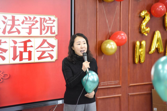 随后,学院老教师金明老师讲话。金老师深情的回顾了数十载执教生涯中的点点滴滴,表达了对法学教育事业的热爱、对学院的深厚感情以及对同事们的真诚感谢。她眼含热泪的讲述与诚挚祝福,深深触动了在场每一位老师。